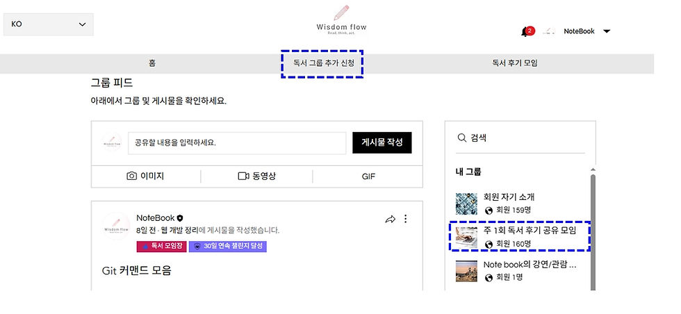 독서 그룹 추가 신청 (페이지) → (화면 우측의) 내 그룹 → 주 1회 독서 후기 공유 모임. (선택)>